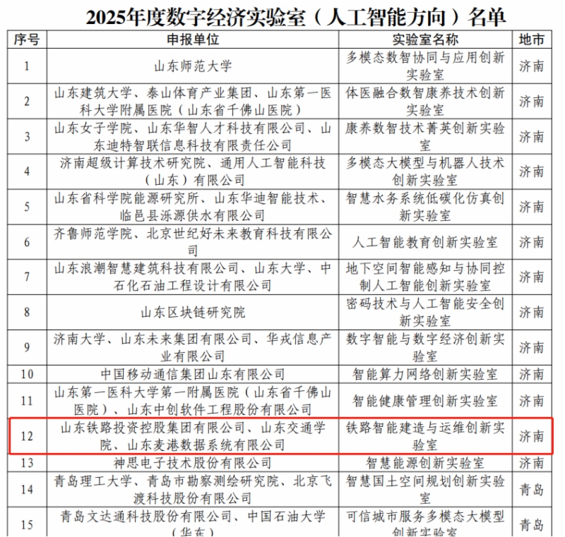 日前,山東省工業(yè)和信息化廳公布了2025年度山東數(shù)字經(jīng)濟(jì)創(chuàng)新平臺名單,集團(tuán)牽頭申報的“鐵路智能建造與運(yùn)維創(chuàng)新實驗室(人工智能方向)”成功入選,成為本次25家獲批單位之一,標(biāo)志著山東鐵投集團(tuán)在人工智能關(guān)鍵技術(shù)研究與創(chuàng)新應(yīng)用方面邁出了堅實一步。