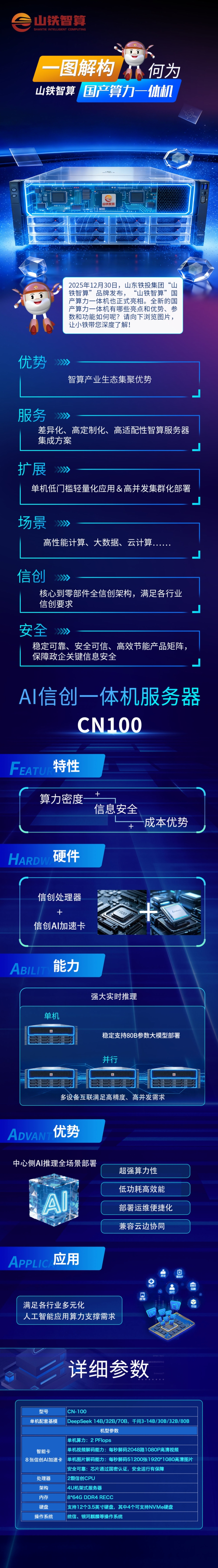 2025年12月30日,山東鐵投集團“山鐵智算”品牌發(fā)布,“山鐵智算”國產(chǎn)算力一體機也正式亮相。全新的國產(chǎn)算力一體機有哪些亮點和優(yōu)勢、參數(shù)和功能如何呢?請向下瀏覽圖片,讓小鐵帶您深度了解!