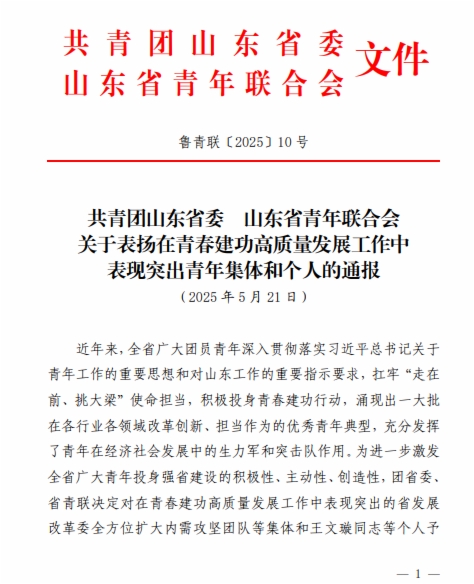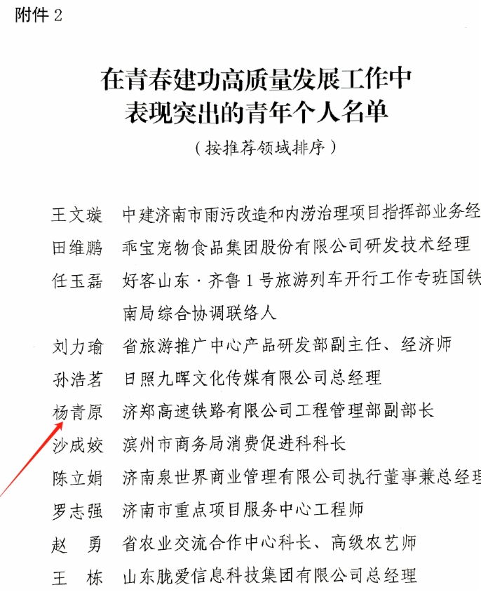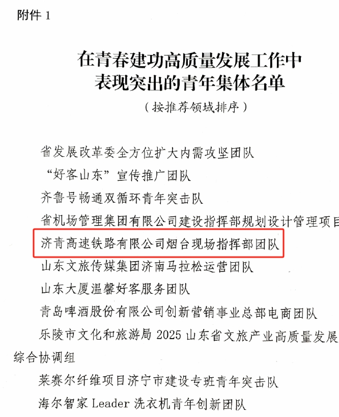 日前,共青團(tuán)山東省委、山東省青年聯(lián)合會發(fā)布《關(guān)于表揚(yáng)在青春建功高質(zhì)量發(fā)展工作中表現(xiàn)突出青年集體和個人的通報》,山東鐵投集團(tuán)濟(jì)青高速鐵路有限公司煙臺現(xiàn)場指揮部團(tuán)隊(duì)榮獲表現(xiàn)突出的青年集體,濟(jì)鄭高速鐵路有限公司工程管理部副部長楊青原榮獲表現(xiàn)突出的青年個人。